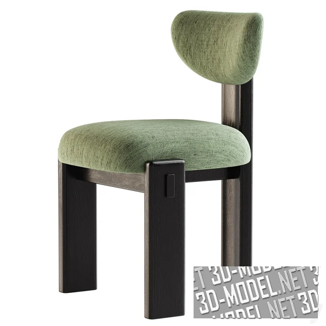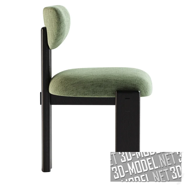 Мягкий современный стул Elio, на трех широких деревянных опорах. Каркас и опоры пропитаны черным маслом. Мягкое сиденье и небольшая горизонтальная, чуть изогнутая, спинка обиты бледно-зеленым текстилем.