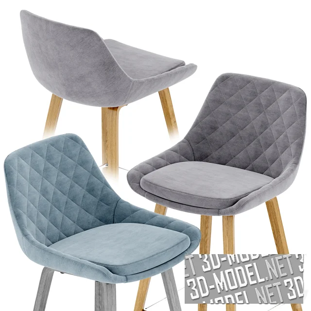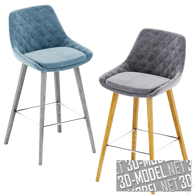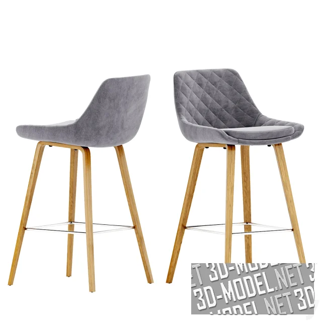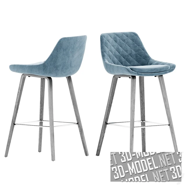 Мягкий барный стул Joan от Element. Стул с деревянными ножками, невысокой стеганой спинкой и выгнутым сиденьем с дополнительной мягкой вставкой. Простежка на внутренней плоскости корпуса образует геометрический паттерн из ромбов. Ножки выполнены из двух термогнутых деревянных П-образных деталей, в нижней трети соединенных горизонтальной хромированной подставкой для ног. Стулья представлены в двух сочетаниях: серый велюр обивки с ножками из светлого, желтоватого дерева под лаком и бледно-голубой велюр с серым деревом на ножках.