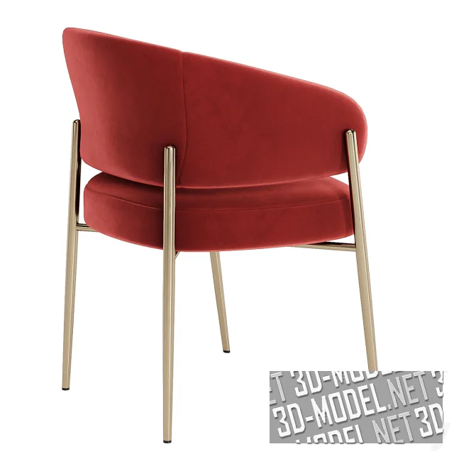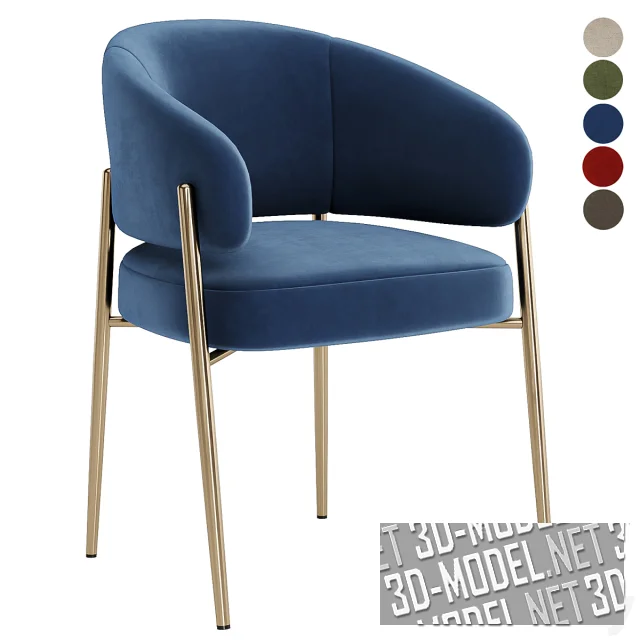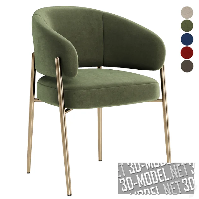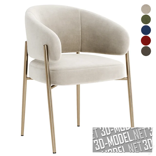 Мягкий современный стул Linda на четырех металлических золотистых ножках, выступающих выше крестовины основания сиденья. Огибающая мягкая спинка переходит в сужающиеся подлокотники. Обивка представлена в пяти вариантах велюра: грязно-белая, темно-оливковая, синяя, пепельно-коричневая, терракотово-красная ткань.
