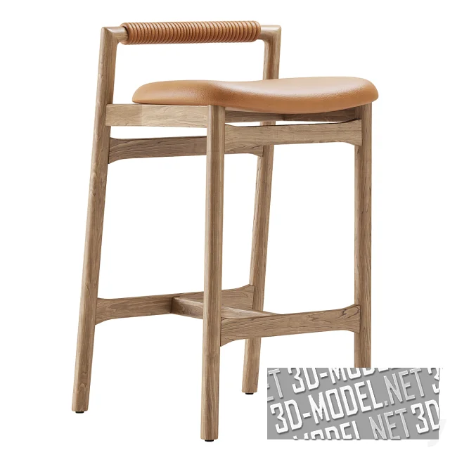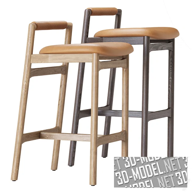 Современный деревянный барный стул Baden от Four Hands. Деревянные ножки круглого сечения, соединены Т-образной стяжкой в нижней части. Задние ножки, поднимаясь немного над мягким сиденьем, соединены горизонтальным, декорированным кожаной обмоткой, элементом низкой спинки. Сиденье обито рыжей кожей. Отделка дерева представлена в двух вариантах: дерево под прозрачным матовым лаком (на полу-барном стуле) и дерево под темным лаком.
