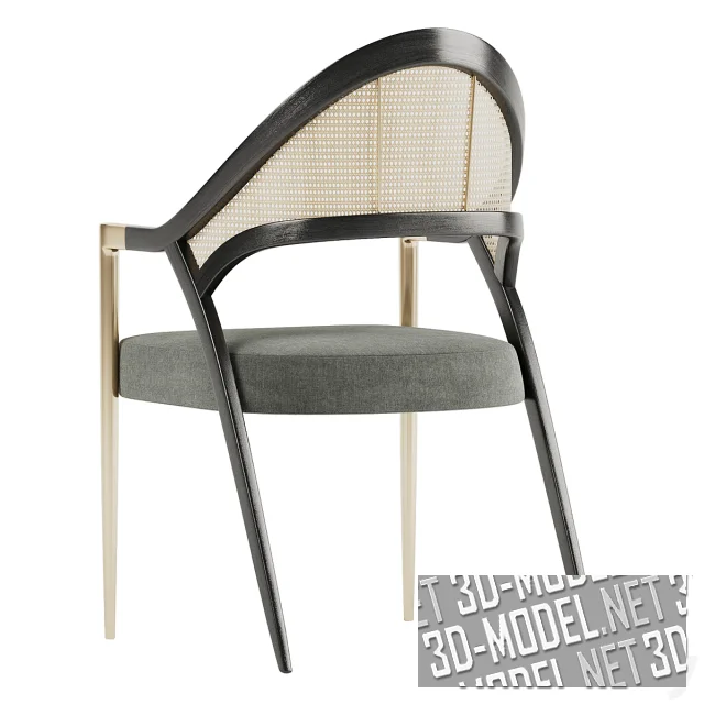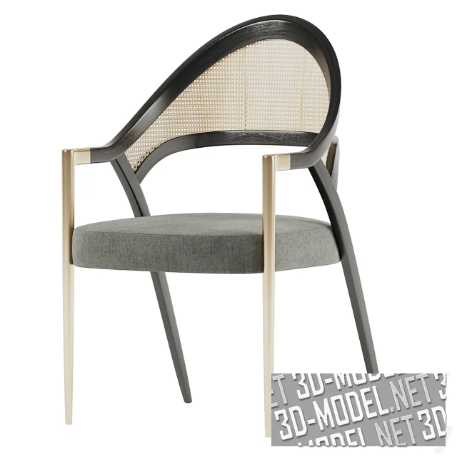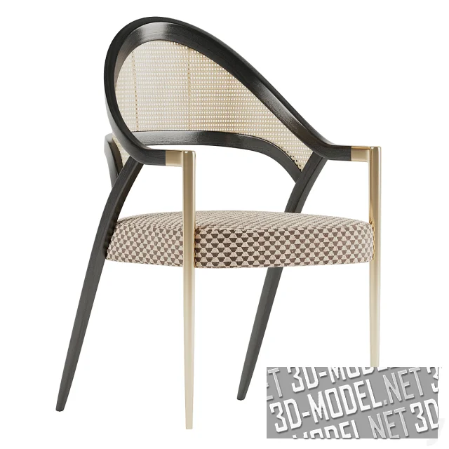 Элегантный современный стул PIERRE от Bercelona Design. Несущий каркас скомбинирован из золотистого металла и венге. Огибающая плоскость спинки заполнена мелкой ажурной плетенкой из ротанга натурального цвета. Обивка мягкого сиденья представлена в двух вариантах: серый меланжевый текстиль, материал с мелким светло-бежевым с коричневым геометрическим орнаментом.