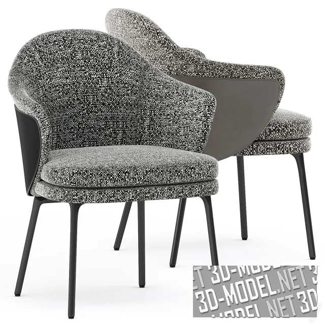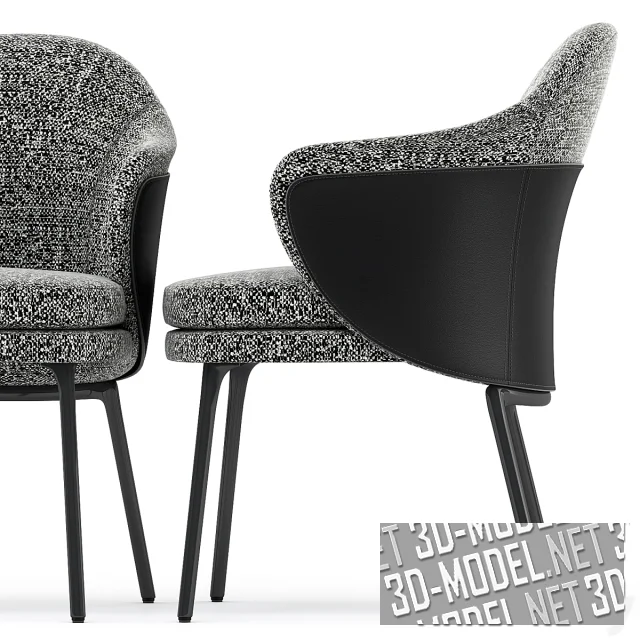 Современные обеденные стулья Angie от Minotti (дизайн: GamFratesi Design). Мягкая обивка скругленной криволинейной огибающей спинки, переходящей в «крылья» подлокотников, мягкой подушки и основы сиденья обиты текстилем в крупную хаотичную черно-белую крапинку. Мягкие элементы смонтированы на каркасе с четырьмя черными ножками. Задняя плоскость спинки огибает фигурный элемент из седельной кожи серого или черного цветов. Габарит стула: 63х62х81-47см.