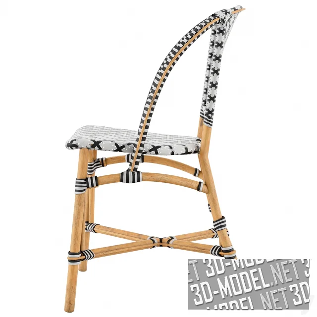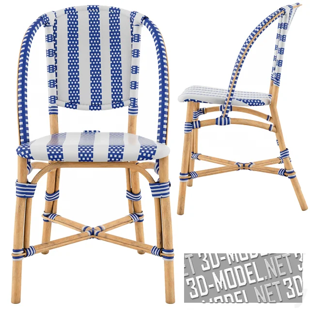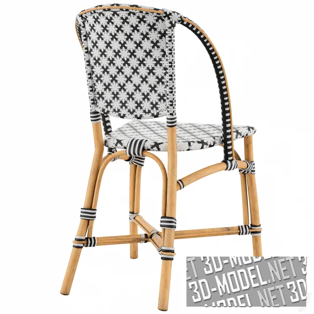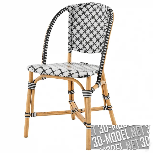Современный стул Bistro с каркасом из натурального дерева (бук), имитирующего ротанг. Легкая кривизна ножек, П-образные гнутые перемычки и распорки перетянуты перемежающимися шнурами и полосами в двух цветах. Сиденье, спинка и гнутый элемент спинки-подлокотников отделаны чехлами с геометрическим двухцветным паттерном. Обивка и обмотка представлена в трех вариантах сочетаний: белого и мятного, черно-белого, сине-белого. Габарит стула: 56х51х89см. Высота сиденья - 45см.