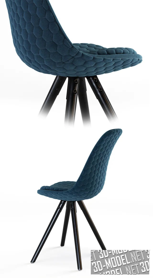 Элегантный современный стул CC0224CWQ26 - LARS от Julia Grup (Испания). Четыре черные ножки сходятся в центральную точку под сиденьем. Эргономичная вогнутая спинка с сиденьем выполнены в виде моноблока и дополнены небольшой подушкой на сиденьи. Задняя и нижняя плоскость стула и подушка сиденья декорированы прострочкой в виде шестигранных сот. Внутренняя плоскость спинки гладкая. Мягкий приятный бархат обивки представлен в благородном синем цвете (Blue Cowboy). Габарит стула: 86х48х56см.