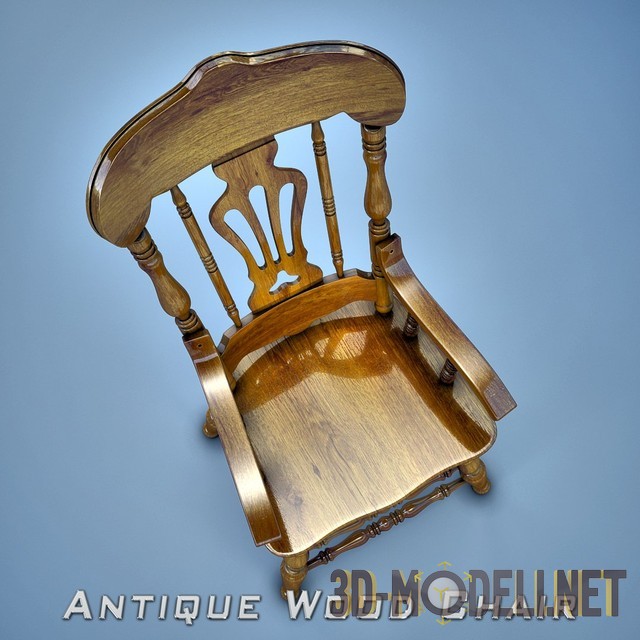 3d-модель деревянного стула, собранного из отлакированных фигурных деталей. Точеные ножки, соединенные точеными распорками, сложная резная спинка, причудливые фигурные подлокотники со столбиками – все играет на определенный ретро-стиль в интерьере.