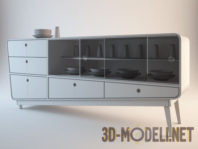 Тумба в стиле шестидесятых годов двадцатого века. Новаторские идеи тех времён, культурная революция и смелость взглядов производителей мебели безусловно отразились на внешнем виде этой тумбы. Она как будто сломана и наклонена вбок. На самом деле этот эффект создан сознательно. Корпус наклонен относительно горизонта, левые и правые пары ножек разной высоты. При этом основная, дополнительная полка и верхняя плоскость корпуса горизонтальные. Углы корпуса скруглены. Вместо ручек в фасадах просверлены круглые сквозные отверстия. Корпус и фасады изготовлены из светлого дерева, что хорошо сочетается с черным цветом ножек и каркаса. Дополняет модель набор посуды, стоящий на полках и сверху. Это большие белые тарелки, чёрные поменьше и высокие прозрачные вазы.
