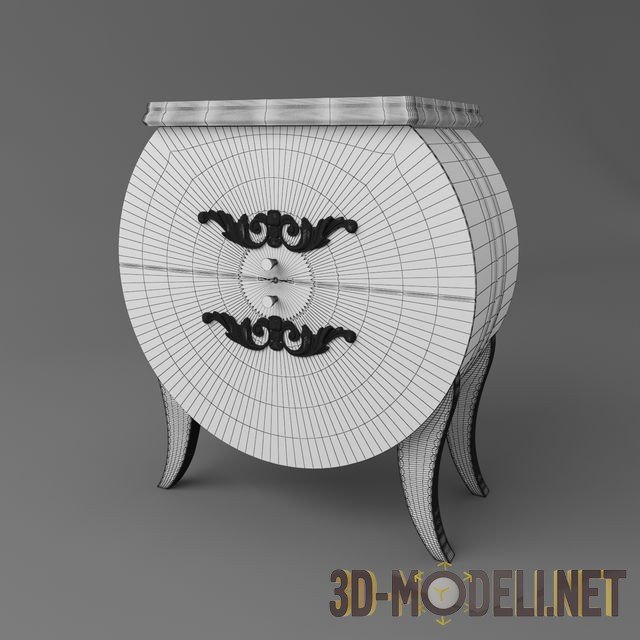 Прикроватная тумба в классическом стиле, фронтальная часть которой выполнена в виде круга, срезанного сверху. По фасаду тумбы размещены два выдвижных ящика с небольшими ручками и барельефным декором в стиле барокко. Ножки гнутые, деревянные. По боковой поверхности цилиндра корпуса размещён двойной золотистый молдинг. Столешница прямоугольная с фигурной кромкой. Тумба выкрашена в белый цвет.