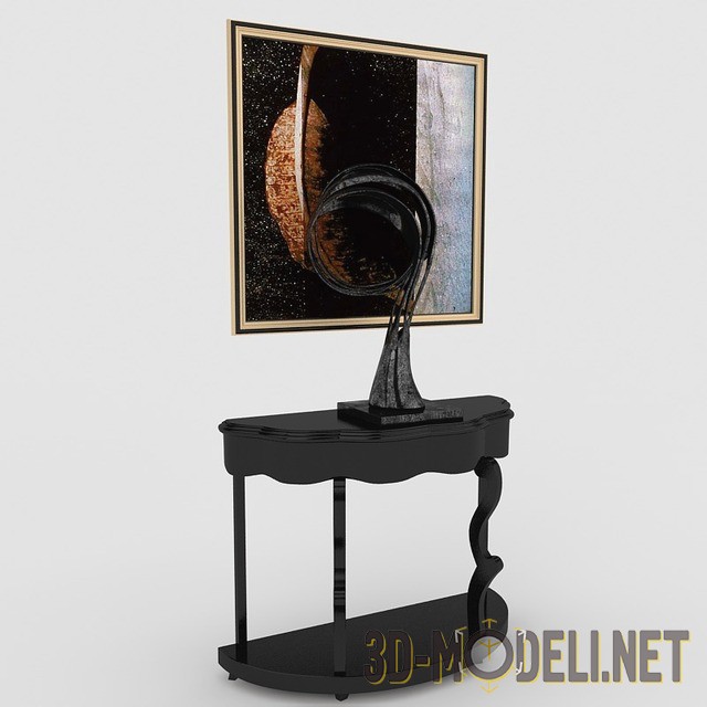 3d модель черной консоли. Элегантный консольный столик, будет одинаково хорошо уместен и в пространстве спальни, и в прихожей. Изюминку консоли придает, конечно же, изысканный черный цвет, а также одна из четырех, фигурная ножка.
