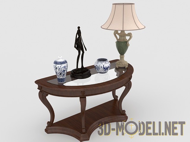 3D модель консоли со стеклянной столешницей. Деревянная изящная консоль-туалетный столик, благодаря столешнице из прозрачного стекла смотрится легко и изящно. Четыре резные ножки создают игривое настроение. Такая консоль будет отлично смотреться в любом элегантном пространстве.