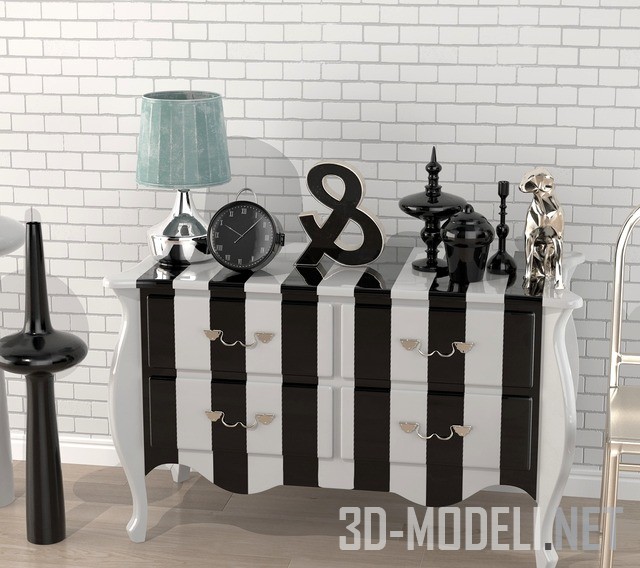 Комод с изящным дизайном и комплектом различных декоративных элементов. Настольная лампа с голубым абажуром, часы, вазы и статуэтки удачно сочетаются на поверхности комода. Высокие вазы и легкий стул дополняют композицию по бокам. Все аксессуары цветовой гаммой отлично сочетаются с полосатыми фасадами комода.