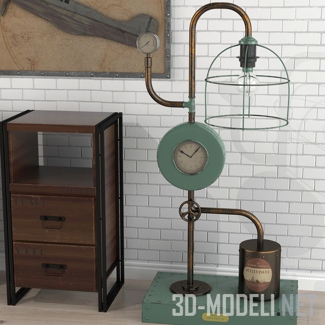 Пара винтажных тумб с потертыми фасадами на выдвижных ящиках составляют основу набора, который дополняют панно на стене, с силуэтами моторных самолетов. Рамки панно сделаны из металлической полосы с заклепками. Напольный светильник в стиле лофт собран из медных, плавно изогнутых, труб. Прямоугольная металлическая площадка, корпус манометра и соединительные муфты на декоративной стойке светильника серо–зеленые, с декоративной проклепкой. Дополняют конструкцию светильника железный бак и проволочный каркас абажура.