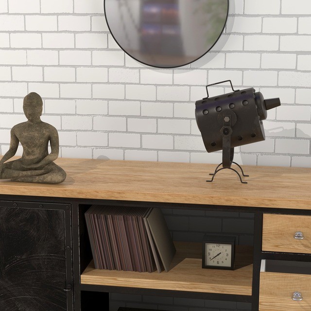 Прямоугольная тумба на ножках из темно-шоколадного дерева со светло-коричневой столешницей, полками и фасадами ящиков светло-коричневого цвета. Справа достаточно широкая дверца, слева четыре ящика, один из которых наполовину выдвинут. На полках стоят часы-будильник квадратной формы, светло-серый ящичек для инструмента и стопка коричневых папок. Слева на тумбочке глиняная фигура сидящего брахмана или будды. Над тумбочкой висит круглое зеркало. Модель детальная, качественная, с текстурами.