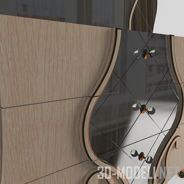 Комод Termo в классическом стиле, из светлого дерева, со вставкой на ящиках из фацетированного зеркала с декоративными большими зеркальными панелями по обеим сторонам комода.