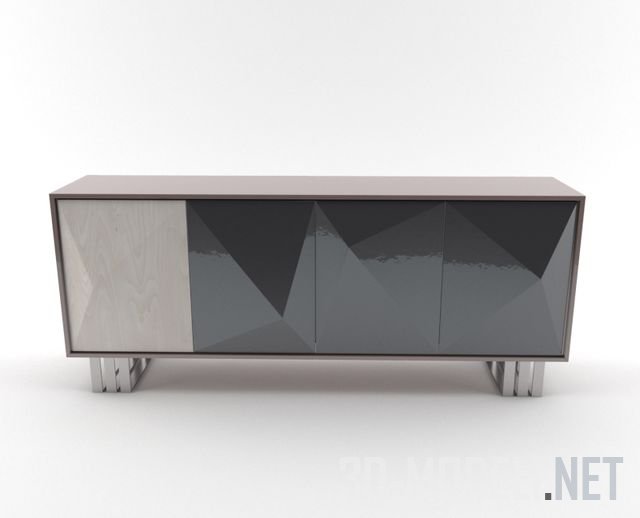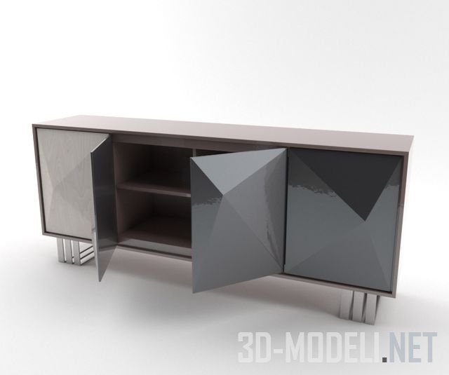 Современный комод серо-серебристого цвета, с глянцевыми фасадами. Комод на металлических плоских тройных ножках. Его размеры: 2400 х 1000 х 500 мм.