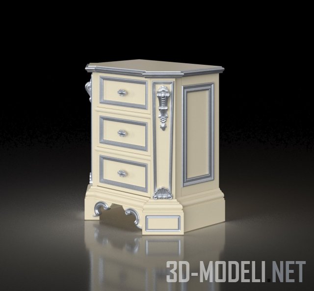 Небольшой комодик, или тумба, оснащена тремя выдвижными ящиками. Производитель – Modenese Gastone, Италия. Основной цвет тумбы, слоновая кость, прекрасно сочетается с серебристой отделкой.