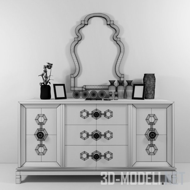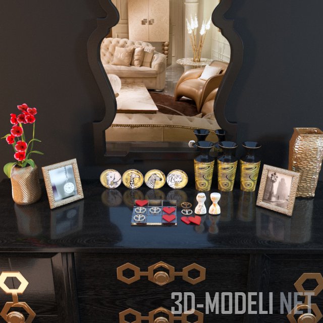 Массивный комод от Jonathan Adler, выполнен из черного дерева с золотой отделкой. На комоде стоят несколько золоченых декоративных тарелок с изображениями африканских животных, часы и цветок в горшке с мелкими красными цветочками.