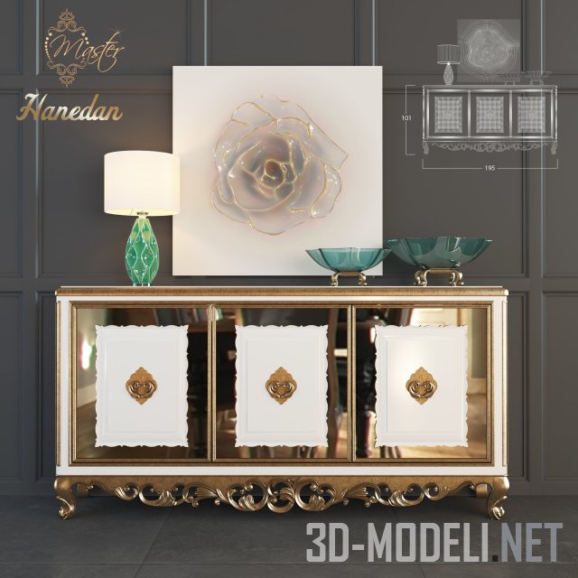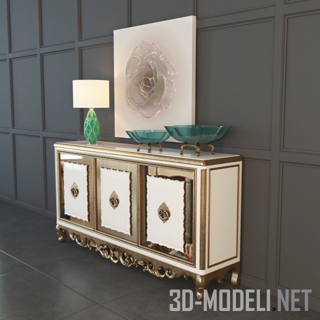 Классический комод Master mobilya Hanedan, размером 195 х 101 см. Дополнен современной настольной лампой Emmet с глазурованной керамической основой (ширина лампы 34 см, высота 60 см), а также стеклянными декоративными чашами бирюзового цвета, с латунными ножками, и резным панно с розой. Все элементы гармонично сочетаются между собой.