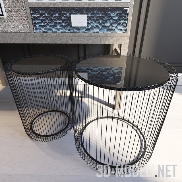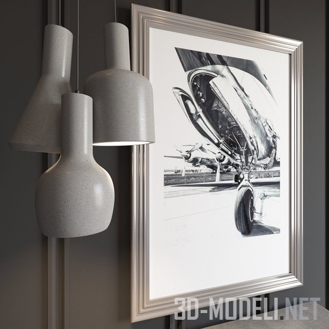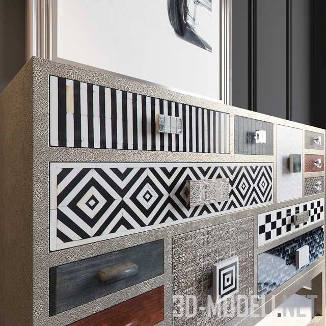 Комод с оригинальными фасадами составляет основу этого декоративного набора от Kare design. Дополнен подвесными бетонными светильниками, картиной и сквозными табуретами.