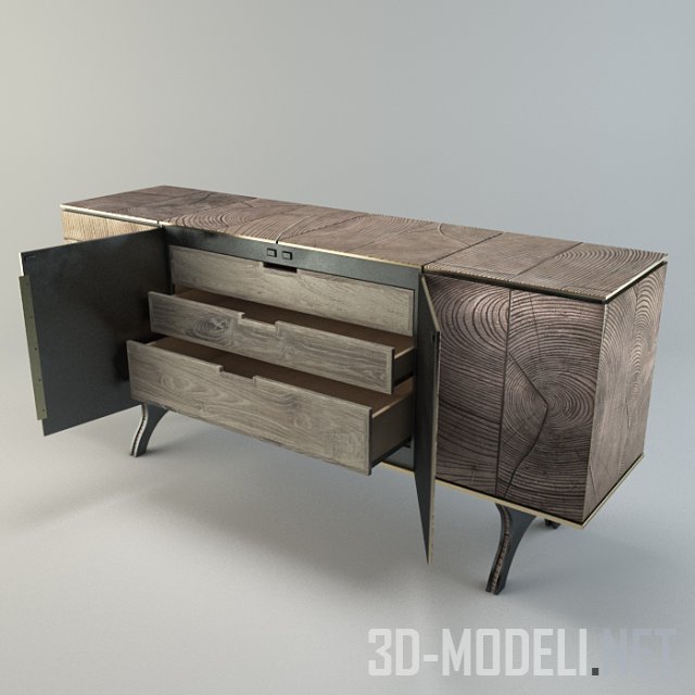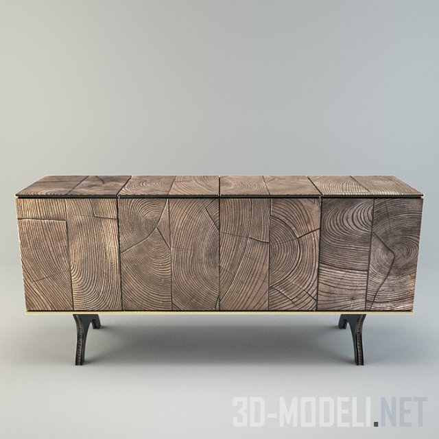 Удлиненный комод Muir Cabinet производства Tuell and Reynolds, Калифорния. Фасады комода выполнены из дерева с сохраненной структурой среза. В модели предусмотрена возможность открытия створок и выдвижения ящиков.