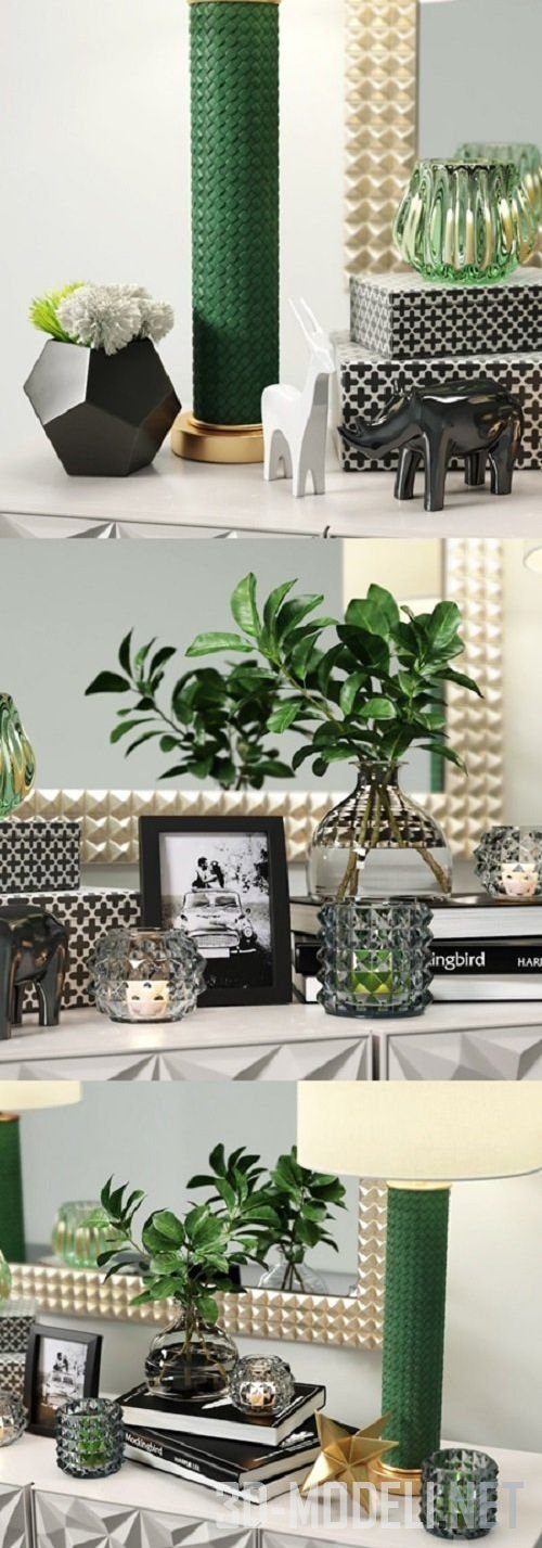 Современный комод с объемными фасадами, с оригинальным трехмерным эффектом. Аксессуары зеленого цвета отлично гармонируют с рамой зеркала и фасадами комода, и также имеют трехмерные поверхности. Это настольные лампы, различные вазочки, фотографии и зеленые ветки.