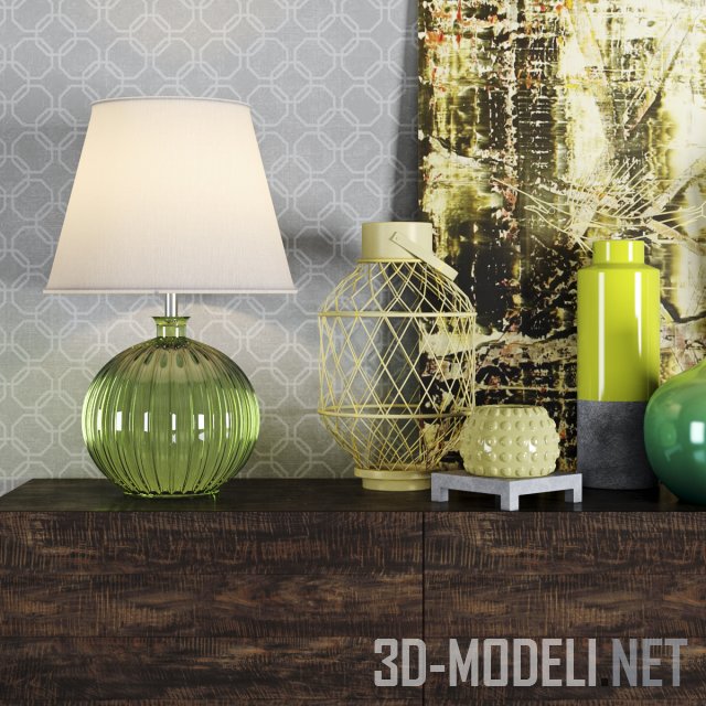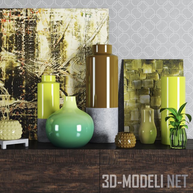 Декоративный консольный стол прямоугольной формы с гладкими фасадами. Фасады коричневого цвета с ярко выраженной структурой дерева. На столе стоит несколько глянцевых ваз разной формы и расцветки, две абстрактные картины и настольная лампа со стеклянным основанием.