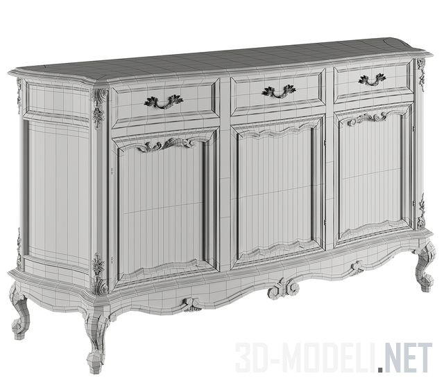 Красивый большой комод 2032 итальянского производства (Vittorio Grifoni) для классического интерьера. Фасады трех дверей украшены фигурными филенками и резьбой. Основной цвет светлый, хорошо гармонирует с темной столешницей. Размеры комода: 202 x 53 x 111 см.