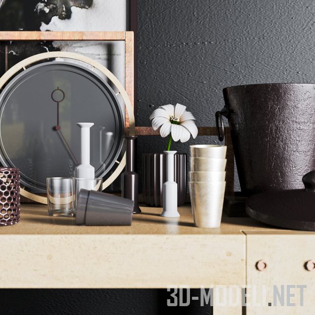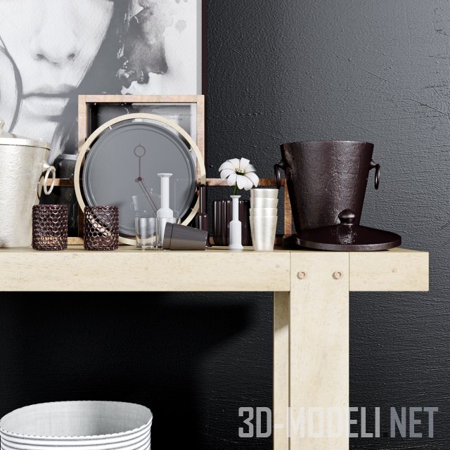 Композиция из аксессуаров, интерьерного декора и лаконичного столика из толстых реек светлого дерева. Под столиком - две белые современные корзины для белья. На столешнице: стеклянные сосуды в виде лабораторной посуды, рельефные стаканы из коричневого стекла, серебристо-жемчужное и черное ведра для льда, каминные часы в современном стиле, с графитового цвета циферблатом и корпусом из светлого дерева, в цвет столика, стаканчики и флакончики. Фоном для композиции служит крупный черно-белый женский фотопортрет, стилизованный под живопись.