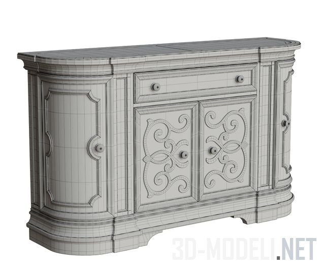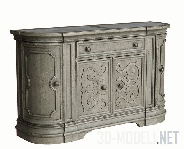 Буфет-креденс в рустикальном стиле Grand Estates Buffet от Liberty Furniture. Высокая тумба имеет скругленные бока с фасадами, пару створок по передней плоскости и выдвижной ящик. Изделие украшено классическими элементами мебельного декора: филенки и резьба на фасадах, фигурная база и обрамление столешницы. Ручки-пуговки бронзовые. Цвет поверхности дерева серебристо-серый, с многочисленными потертостями и сколами, что придает тумбе антикварный вид. Размеры (в дюймах): W65 x D18 x H38