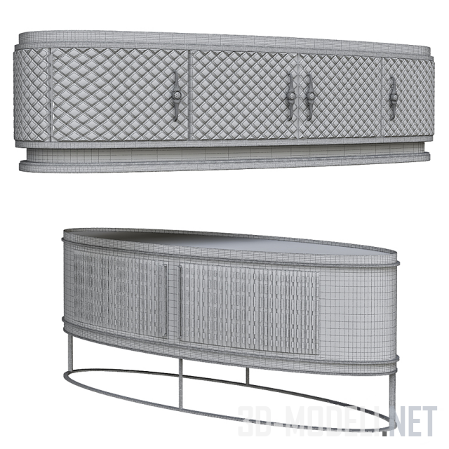Овальные роскошные тумбы-буфеты YFOS от Dimensione Chi Wing Lo. Первый вариант тумбы декорирован рыжей кожей, с мелкой прострочкой капитоне, витиеватыми ручками, золотистым цоколем и черными горизонтальными кромками на цоколе и верхней плоскости. Вторая тумба - отделана под светлую древесину. На легком металлическом каркасе, с парой больших створок, с парой черных ручек и прямоугольной перфорацией.