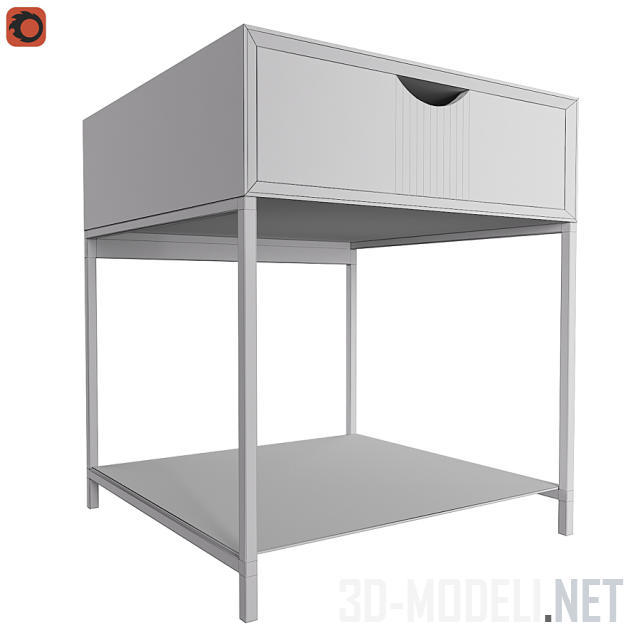 Современный прикроватный столик-тумба Mambo от La Redoute. Основание изготовлено в виде черного каркаса из квадратной профильной трубы с плоской металлической черной полкой внизу. Сверху на каркас смонтирован выдвижной ящик в корпусе из деревянных плит с отделкой «мореный дуб». Фронтальные кромки корпуса запилены под углом, что позволило слегка утопить плоскость фасада ящика. Вместо ручки в верхней части фасада сделана полукруглая прорезь. Габарит тумбы: 50 х 43 х 41 см.