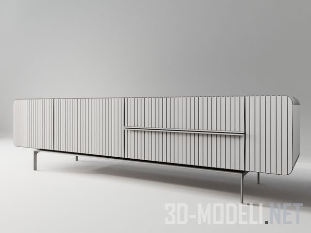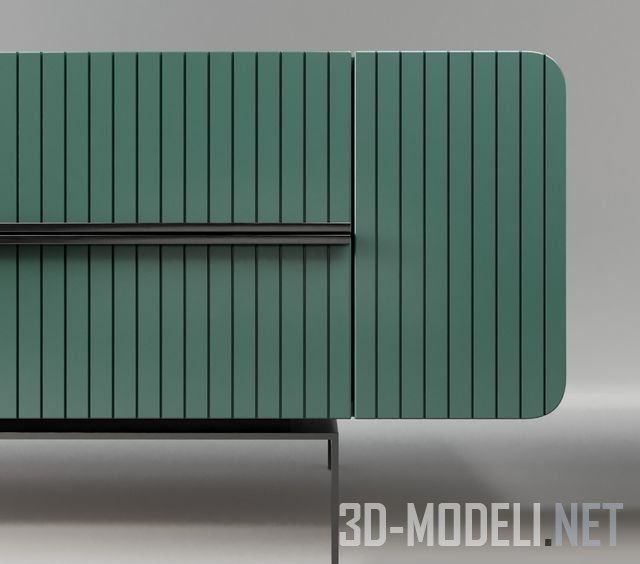 Современная тумба для гостиной от студии HEIMA - OBA. Тумба зеленого цвета (могут быть другие варианты), с закругленными углами. Черные тонкие вертикальные линии фасада из отшлифованного ДВП создают единый узор. Все петли и направляющие ящиков имеют механизм плавного закрывания, который обеспечивает максимальный комфорт использования. На фасаде расположена длинная черная ручка.я Тумба стоит на невысоких стальных ножках с порошковым покрытием. Размеры тумбы: 2000 x 460 x 540 мм.