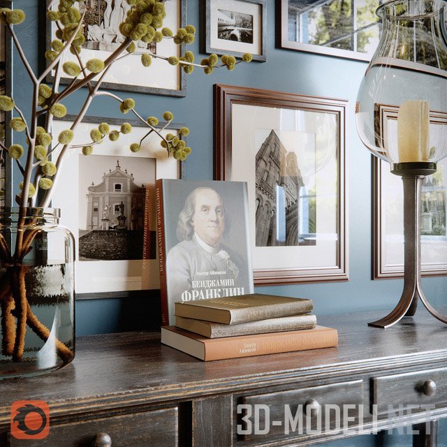 Декоративный набор с консолью, сундуком, мячами и картинами, а также множеством других элементов. Размеры: Ширина: 255,4 см, глубина 60 см, высота 90,4 см.