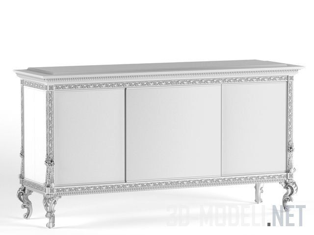 Буфетная трехстворчатая тумба от ZANABONI, с обильным декором в стиле барокко из перламутровых чешуек и деревянной резьбы. Общая тональность отделки серебристо-бежевая, с рыжими и темно-коричневыми элементами. Габарит: 101 х 188 х 58 см.