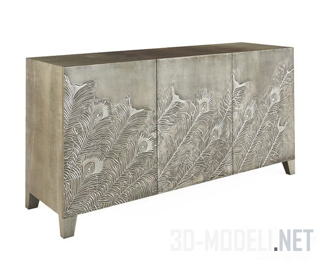 Красивая консоль Peacock Entertainment от бренда Bernhardt. Консоль прямоугольной формы, сделана из тикового дерева. Три фасада отделаны матовым серебром и украшены резным рисунком в виде перьев павлина.