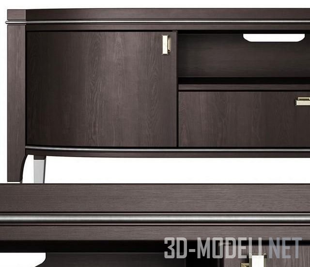 Красивая современная тумба от Dantone Home. Выполнена из дерева шоколадного цвета, с выраженной структурой дуба. Тумба имеет две дверцы по бокам и открытую полку и ящик посередине, с белыми маленькими ручками. Узкий белый молдинг и белые наконечники ножек дополняют впечатление.