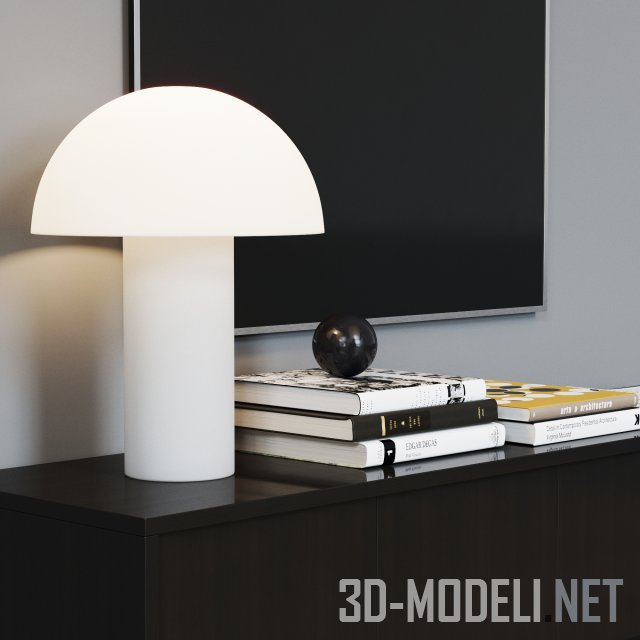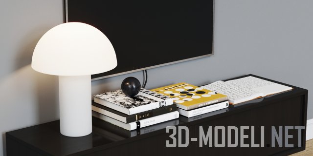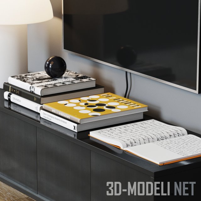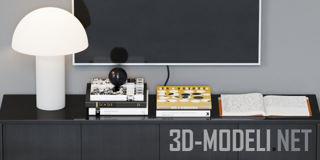 Современная телевизионная тумба (размер: 1500 x 400 x 500). Дополнена различными предметами: в наборе настольная лампа белого цвета, книги. Паркет и плинтус также присутствуют.
