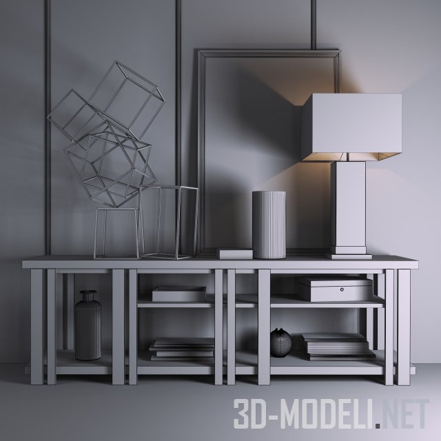 Несколько предметов мебели и декора для современного интерьера в стиле минимализм. Консоль отличает стильный дизайн, открытые секции позволяют интересно расположить предметы интерьера и аксессуары. Декоративные объекты, настольная лампа и картина в черной раме органично вписываются в комплект.