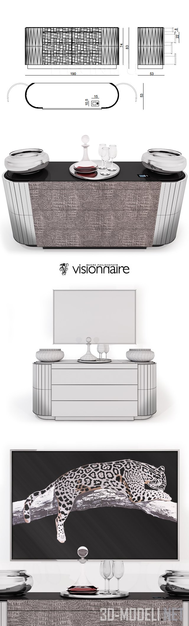 Для интерьера, оформленного в стиле арт-деко отлично подойдет гламурный комод арт.Vaslav IPE Cavalli (Visionnaire). Размеры: (ДхШхВ): 190 x 53 x 83 см. Комод дополнен предметами декора и посуды (симметрично расставленные вазы, графин с бокалами) и картина с изображением леопарда. Все текстуры присутствуют.