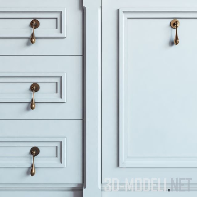 Красивый белый деревянный комод в классическом стиле. Филенчатые фасады дверей и ящиков украшают латунные ручки. Над комодом висит картина в белой раме с абстрактным рисунком. На столешнице стоят две высокие белые настольные лампы по обеим сторонам картины. Габариты комода: 850 х 1970 х 650 мм.