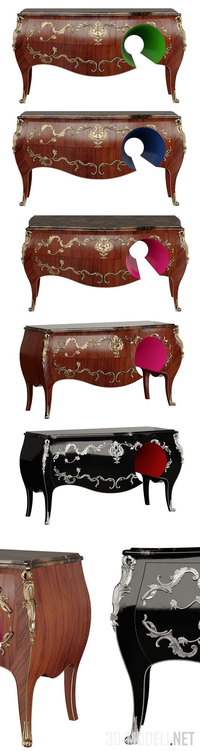 Роскошный классический комод из массива красного дерева, выполненный в стиле Луи ХV – серия Hole, производства итальянской фабрики Fratelli Boffi. Комод оснащен двумя ящиками и декоративными накладными элементами из латуни в виде барочных орнаментов. Столешница сделана из мрамора Emperador. Оригинальной деталью комода, придающей ему современный вид, служит конусная ниша в правой части. Размеры комода: ширина 60 см, длина 165 см, высота 90 см.