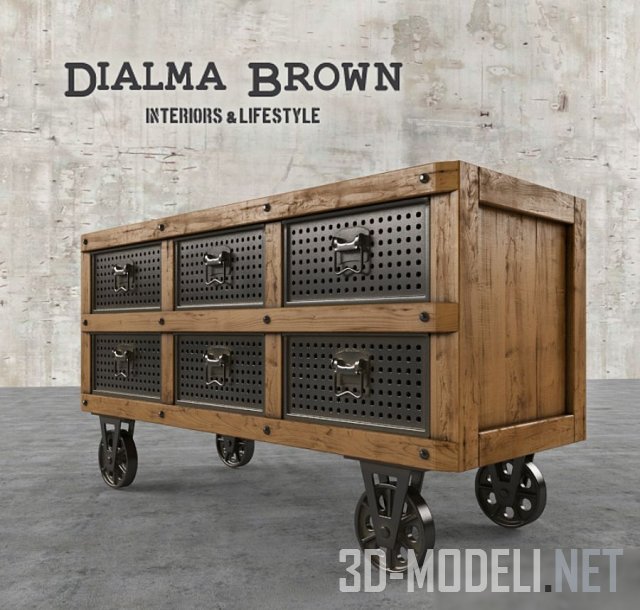 Высокий комод в этно-стиле из вторичного старого дерева светло-коричневого цвета, модель DIALMA BROWN DB003661. Комод имеет 6 металлических ящиков с отделкой под вороненое перфорированное железо и стоит на четырех крупных колесах. Размеры комода:
