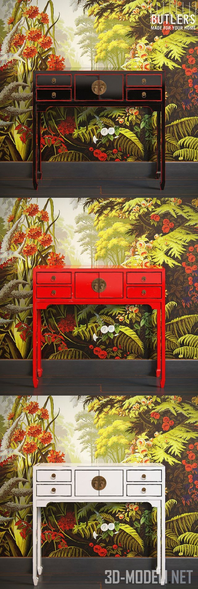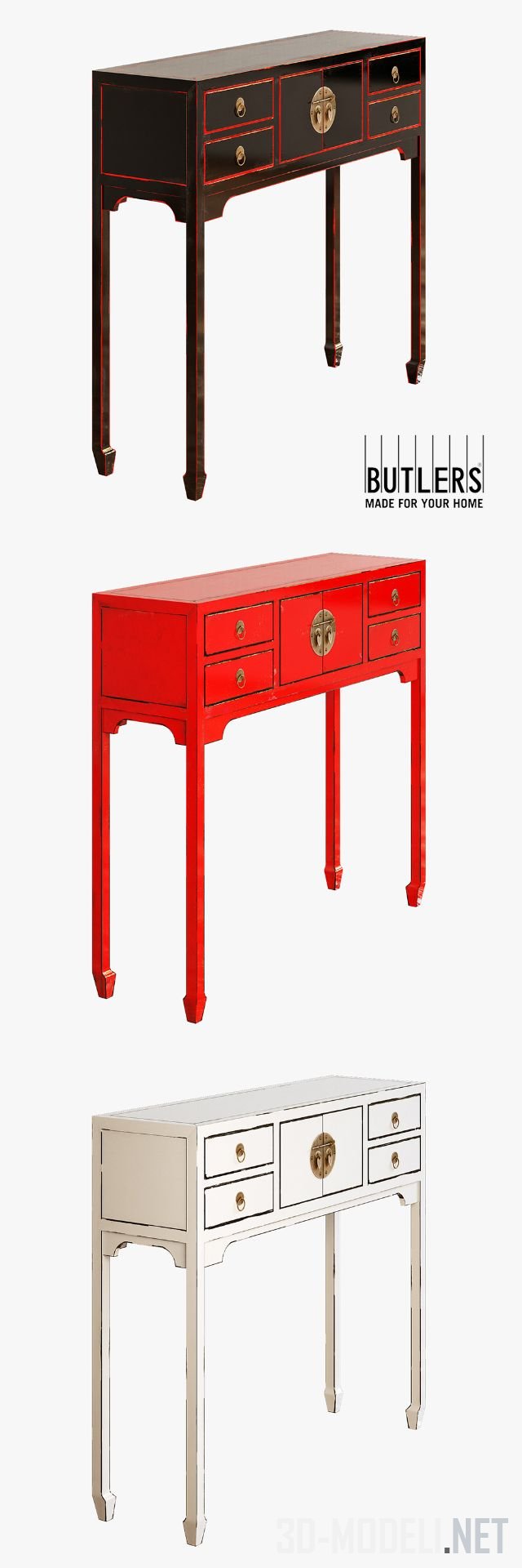 Красивый консольный столик Butlers rising sun, с латунной отделкой. Модель представлена в трех вариантах цвета: темный, красный и белый.