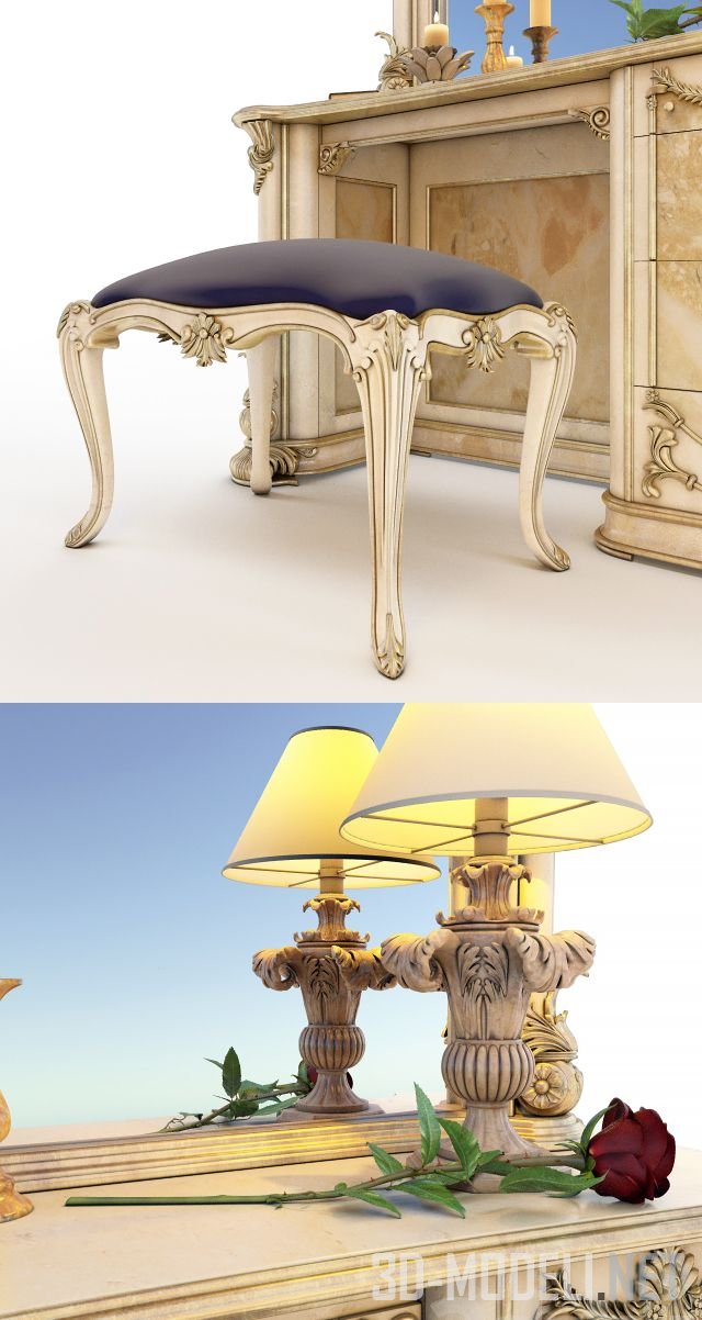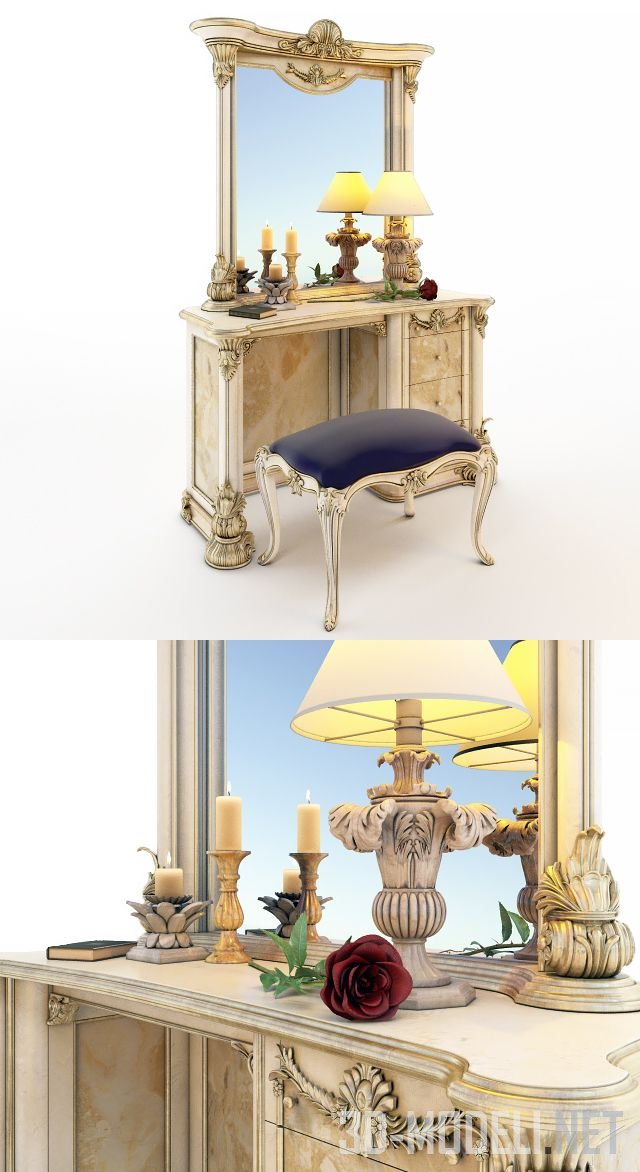 Шикарный туалетный столик-трюмо Moblesa pier glass, отличный выбор для интерьера дамской спальни в классическом стиле. Деревянное резное трюмо цвета слоновой кости с инкрустацией и позолотой выглядит великолепно. На столешнице возле зеркала стоят свечи, настольная лампа с золотистым абажуром и лежит красная роза. Возле трюмо стоит пуфик с мягким темно-синим сиденьем.