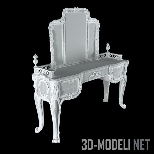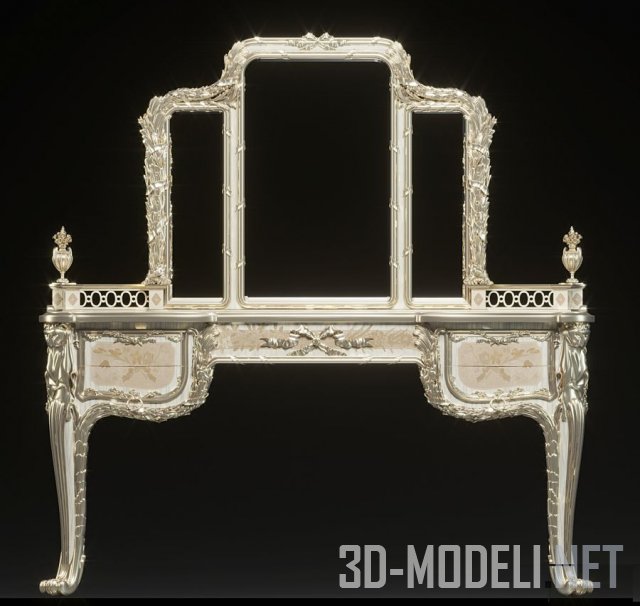 Шикарный королевских комод Louis XV из белого дерева. Комод богато украшен резными деталями золотистого и платинового цвета и резной инкрустацией. Трехстворчатое зеркало в резной раме закреплено на столешнице.