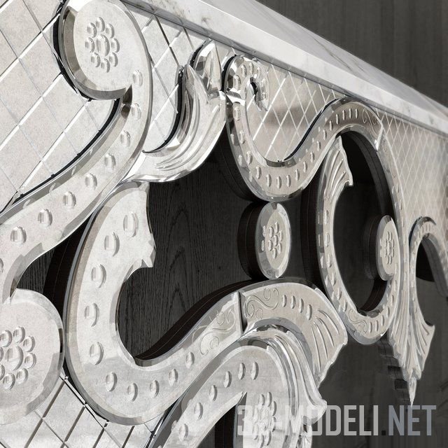 Роскошная консоль из зеркала и белого мрамора Florea от Arte Veneziana. Основание столика выполнено из фигурно-обрезанного зеркала с фацетированными гранями и художественной гравировкой по плоскостям. Тонкая столешница выполнена из материала, имитирующего белый, с серыми разводами мрамор. Габарит консоли: 200 х 45 х 95 см.
