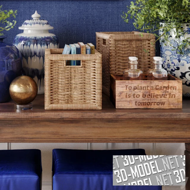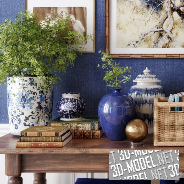 Набор интерьерного декора в ориентальном стиле с консольным столиком, посудой, книгами, фотографиями и картиной на стене. Элементы подобраны в насыщенном синем, кобальтовом цвете с белым (фарфор и керамика) и натуральным деревом. Под деревянным столиком с точеными ножками размещены два пуфа с яркой синей обивкой и подушек сиденья. На столе две крупные бело-синие вазы с мелколистными растениями, фарфоровые урна, масленка, сахарница, еще одна синяя ваза, плетеные ротанговые короба с книгами, деревянный ящик с бутылками, золотистый шар на подставке, старые книги. На стене старые фотографии в сепии и картина с реалистичным изображением буйвола и сухих веток.