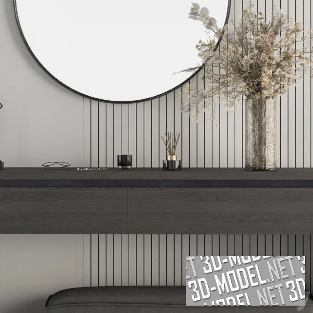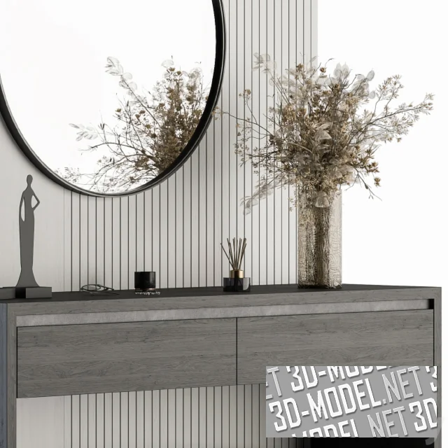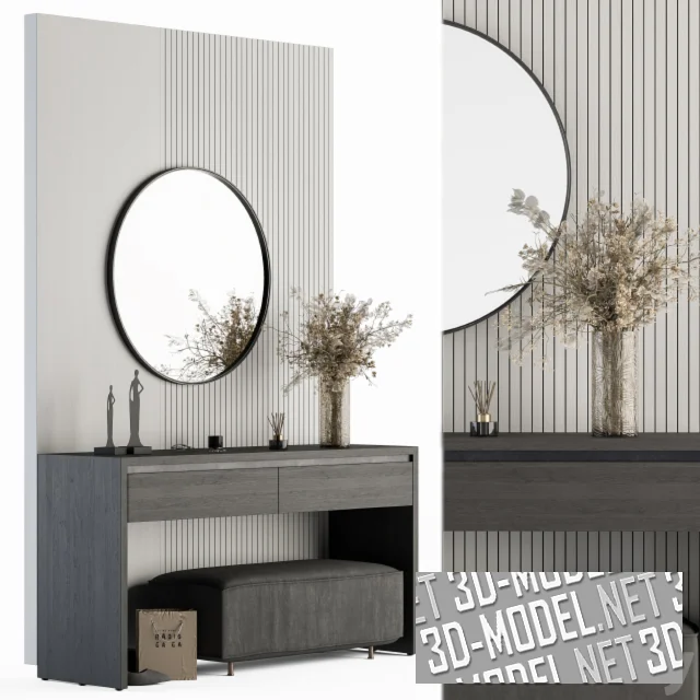 Фрагмент современной прихожей с отделанной стеной, круглым зеркалом, консольным столиком, прямоугольным пуфом, декором и аксессуарами. Стена за зеркалом в тонкой черной раме отделана светло-серыми панелями. Часть стены набрана из вертикальных реек. Консольный столик изготовлен из темно-серых панелей с текстурой дерева. В П-образной основе стола смонтированы два выдвижных ящика. Обивка невысокого прямоугольного пуфика на небольших латунных ножках - темно-серый текстиль. Рядом с пуфом - бумажный пакет из бутика и пара женских темно-серых туфель. На столе: букет сухих цветов в стеклянной вазе, черный аромо-диффузор с палочками, очки, две темно-серые статуетки (женские силуеты).