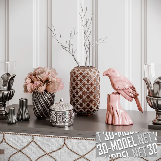 В наборе декора: два крупных серебристых металлических кубка с квадратной площадкой и стеклянной вставкой, серебристые вазы нескольких размеров и вида, букет из цветов нюдового оттенка, розоватая керамическая фигурка птицы, сидящей на пне, керамическая медная ваза с белым восточным орнаментом и сухими ветками в ней, серебристая металлическая круглая шкатулка с рельефными орнаментами. Габарит комода: 122х45х88см.