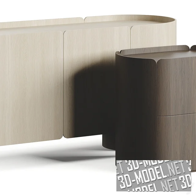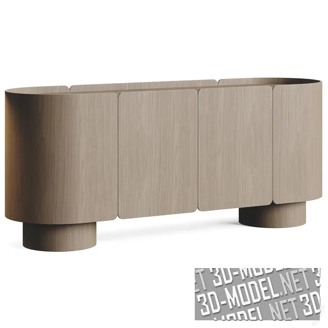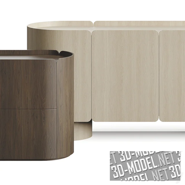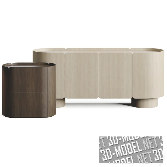 Современная мебель в жилое помещение из одной коллекции от Lulu And Georgia - длинная, высокая тумба-сервант RAPHAEL Living, комод с шестью выдвижными ящиками и прикроватная тумба с двумя выдвижными ящиками. Изделия имеют плавные, скругленные силуэты, овальное сечение в плане, чуть скругленные углы на фасадах и две крупные круглые опоры (у серванта и комода). Ручки на фасадах ящиков и створок отсутствуют. Верхние кромки фасадов, боковые изогнутые и прямые элементы немного выступают над верхними плоскостями  Габариты серванта и комода: 185х55х78см. Габарит тумбы: 71х45х66см.
