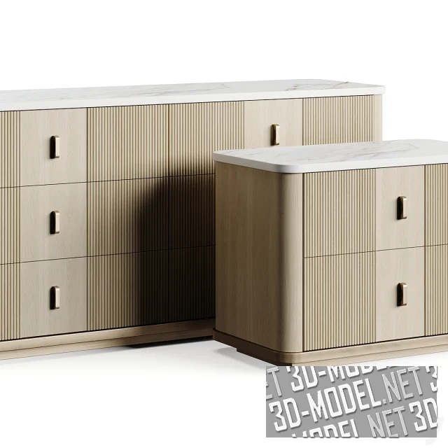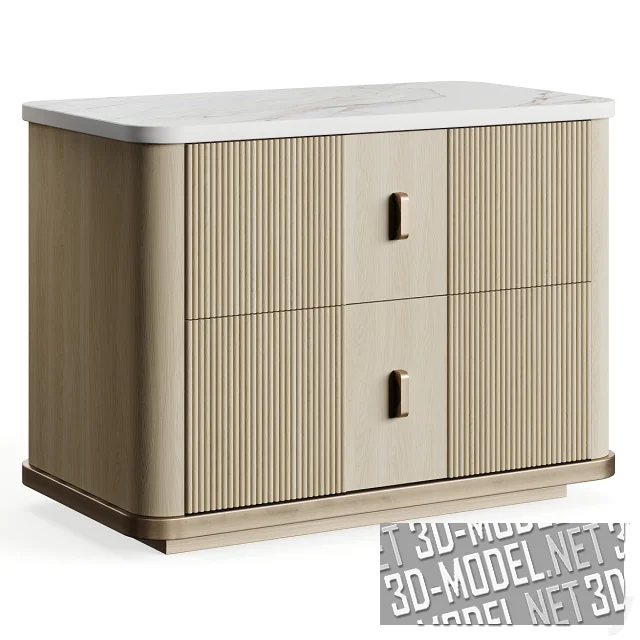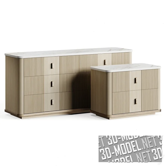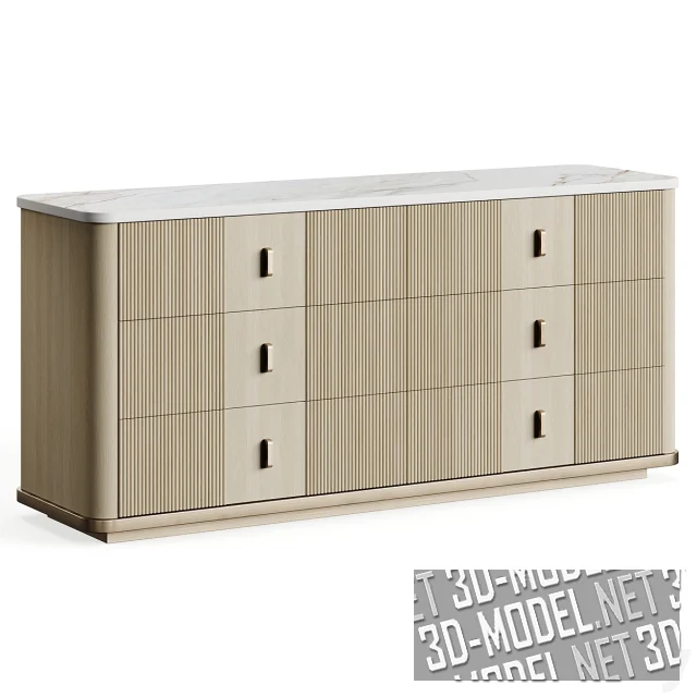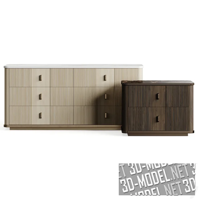 Скульптурные ручки ящиков органично интегрированы в эстетику внешнего вида комода. В сцене представлены два варианта с габаритными размерами: